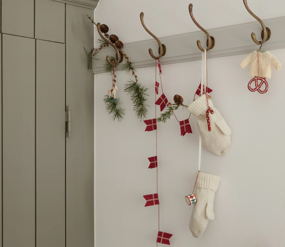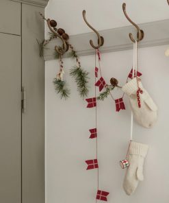 Eine Geschenkbox mit 4 Ornamenten. Jedes Ornament ist in Seidenpapier eingewickelt, zusammen sind sie in einer Box verpackt. Sie ist mit den Zeichnungen von Dorte Mailil verziert. Das Set enthält Trommel, Zuckerstange, Brezel & Schaukelpferd.