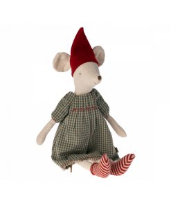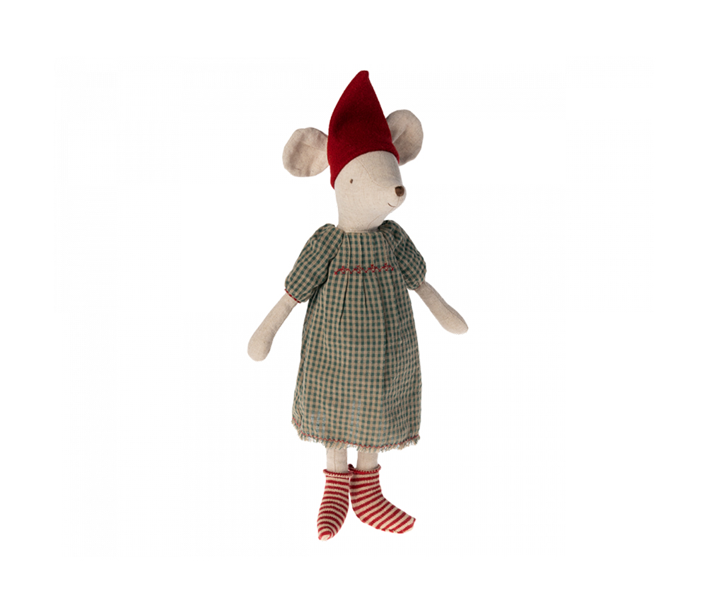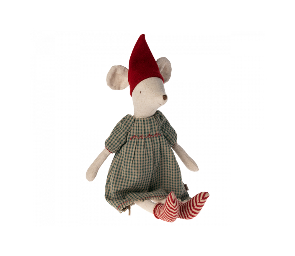 Eine Maus in Größe Medium in kuscheliger Weihnachtskleidung. Verwenden sie zum Spielen oder als Dekoration im Dezember. Der Hut ist abnehmbar, so dass man sich nach der Saison leicht umziehen kann und sie bereit für mehr Spiele ist.