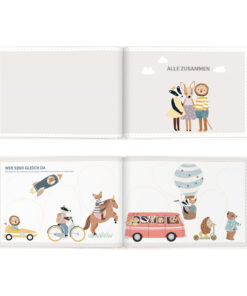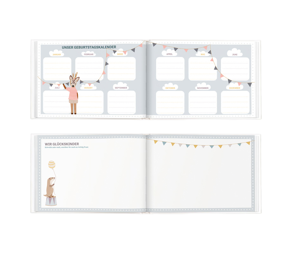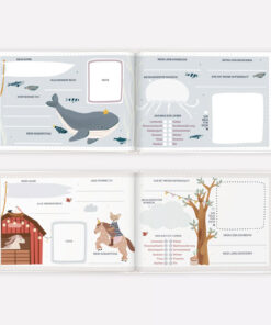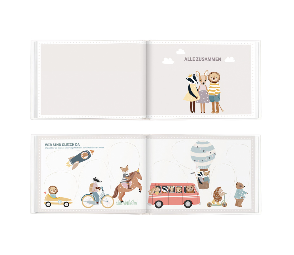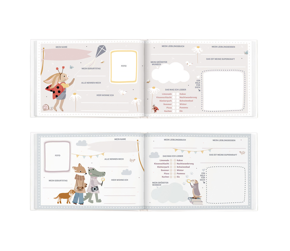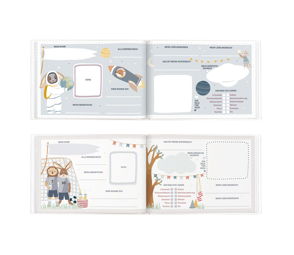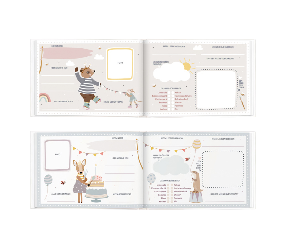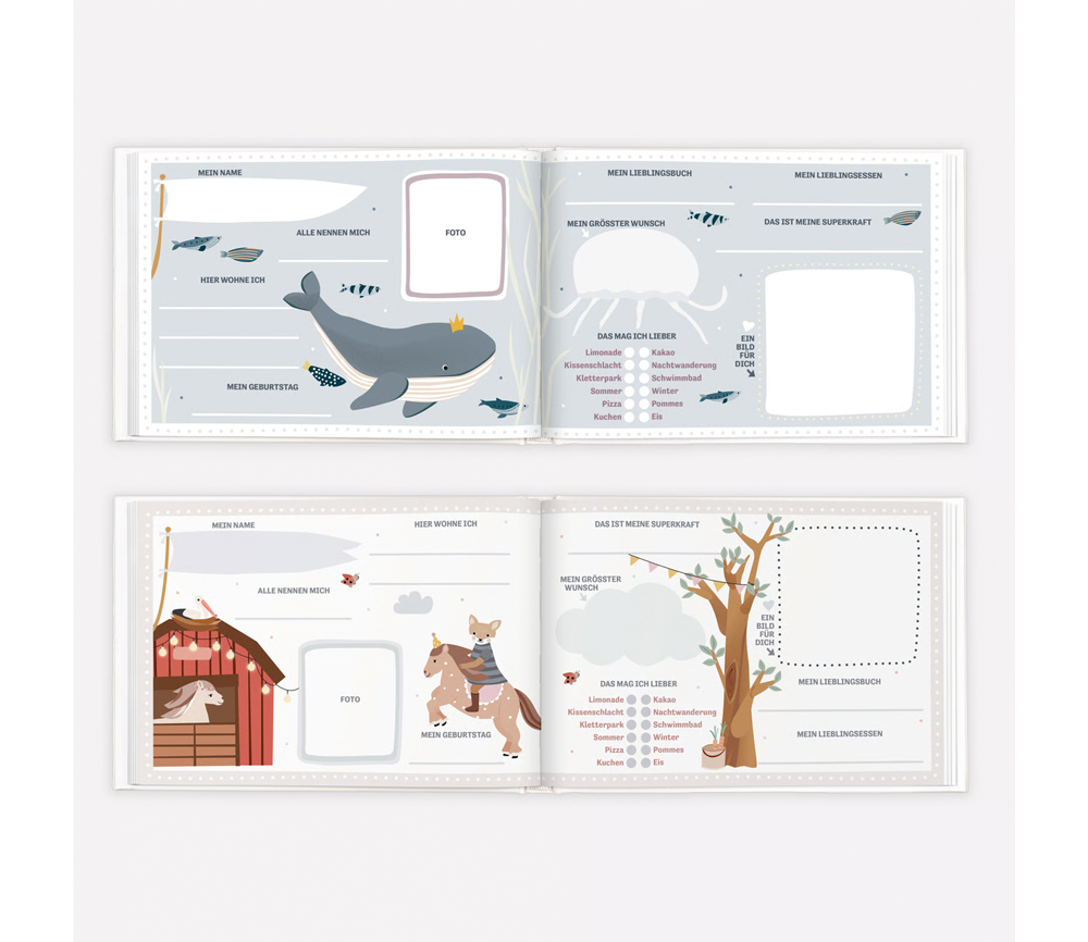Es gibt tolle Mitmachseiten, die gemeinsam ausgefüllt werden können: Geburtstagskalender, Platz zum Einkleben von besonderen Dingen, Seiten zum Eintragen der Lieblingsspiele und Möglichkeiten zum gemeinsamen Malen und Gestalten.