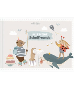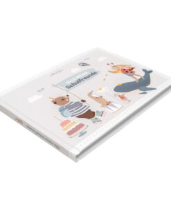 Das Freundebuch „Alle meine Schulfreunde“ ist mit viel Liebe gestaltet und bietet Platz für 24 Freunde. Auf verschiedenen Doppelseiten können sich die Kinder einzeln vorstellen. Sie wählen zwischen acht verschiedenen Themenwelten, wie z.B. Unterwasserwelt, Ponyhof, Detektive, Fußballfreunde, Weltall, …