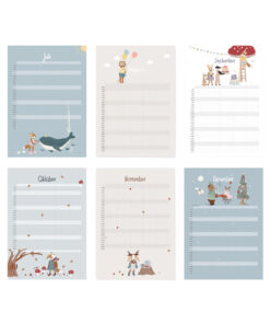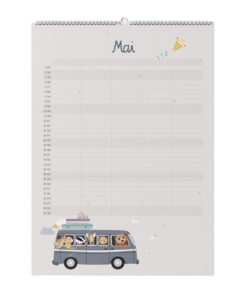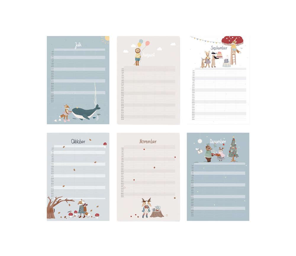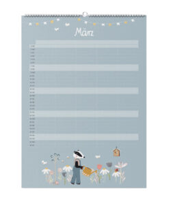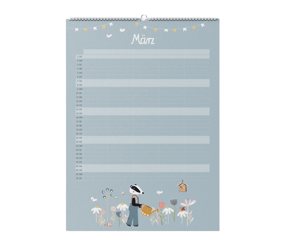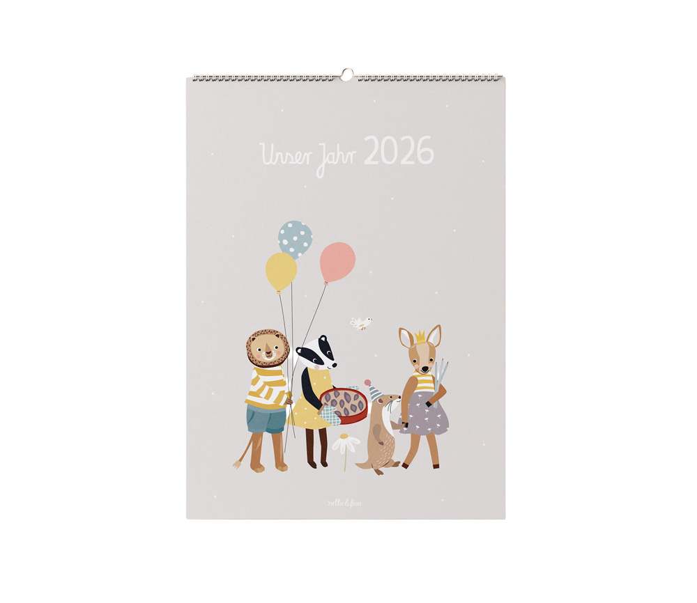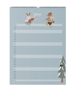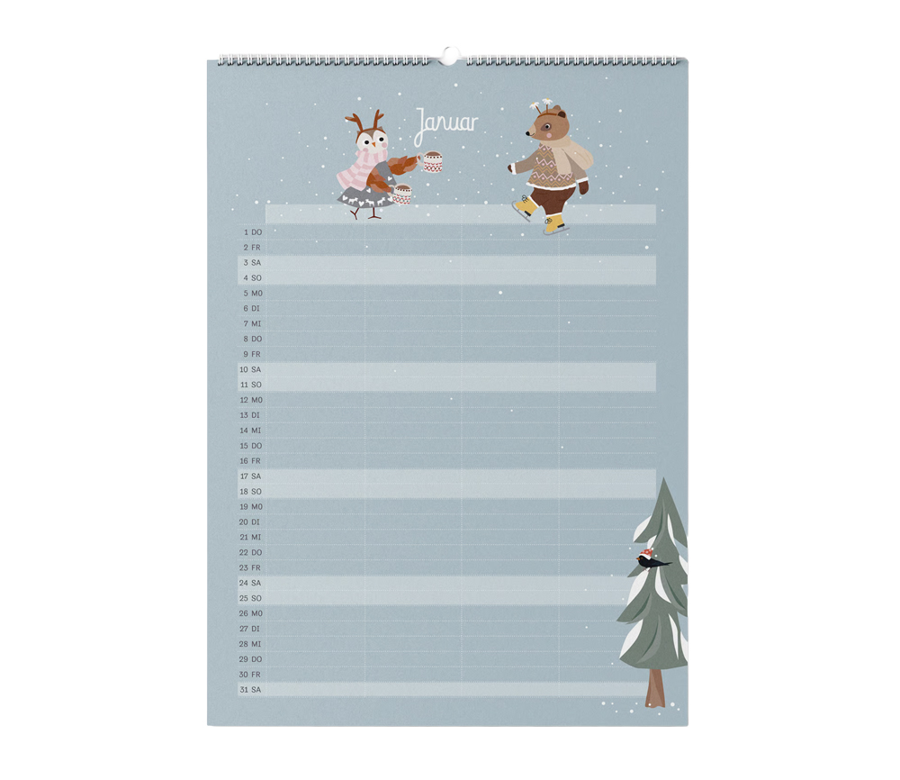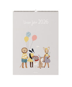 Dieser schöne Wandkalender für das Jahr 2026 ist auf 170g Recyclingpapier gedruckt. Er ist mit 5 Spalten gestaltet und in der Größe DIN A4 (210 x 29,7 cm). Für jeden Monat gibt es eine Seite mit einer Illustration von verschiedenen Tieren wie z.B. einem Dachs der Blumen gießt, einem Bären der Schlittschuh läuft, Rehe, Füchse und andere Tiere. Der Wandkalender ist mit einer weißen Spiralbindung an der oberen Seite gebunden und hat in der Mitte einen kleinen Bügel zum Aufhängen.