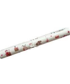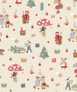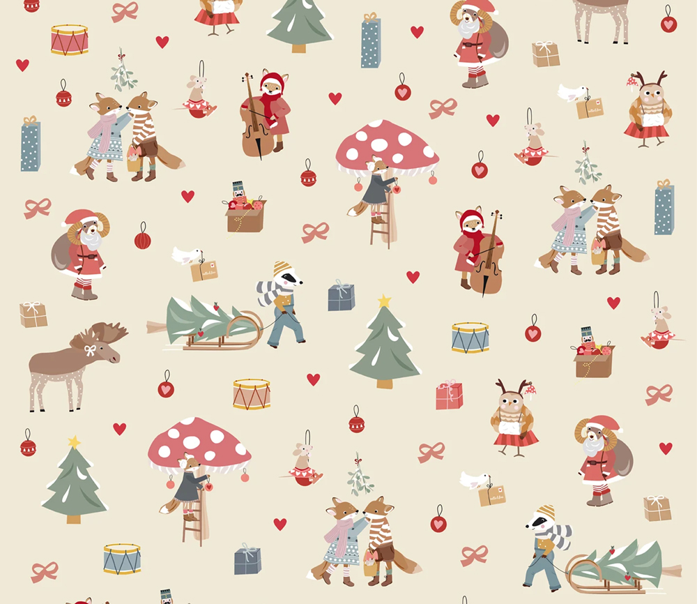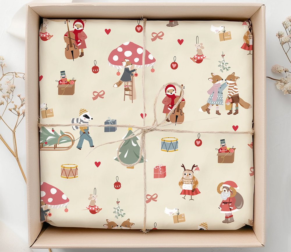 Geschenkpapier für die Weihnachtszeit mit vielen Waldtieren. Ein Dachs, der einen Schlitten zieht, Füchse die sich unter dem Mistelzweig küssen, eine kleine Eule, ein Rentier …