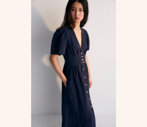 Dieses schmeichelhafte Kleid verfügt über einen V-Ausschnitt, kurze Ärmel mit sanfter Raffung an den Schultern und eine Reihe mit Knöpfen vorne in der Mitte und kombiniert klassisches Design mit moderner Eleganz.