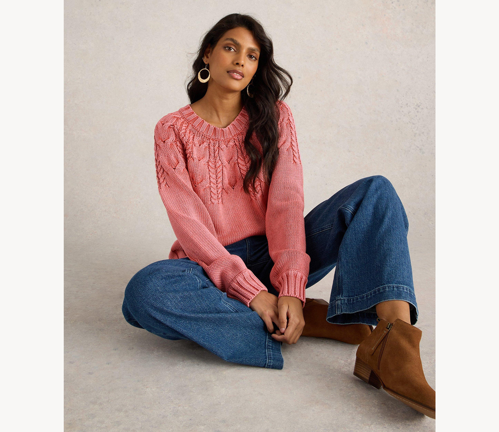 Dieser Strickpullover hat ein modernes Zopfmuster und die Waschung sorgt für einen interessanten Farbeffekt. Und weil er aus Bio-Baumwolle gefertigt ist. liegt er schön weich auf der Haut und ist angenehm leicht.